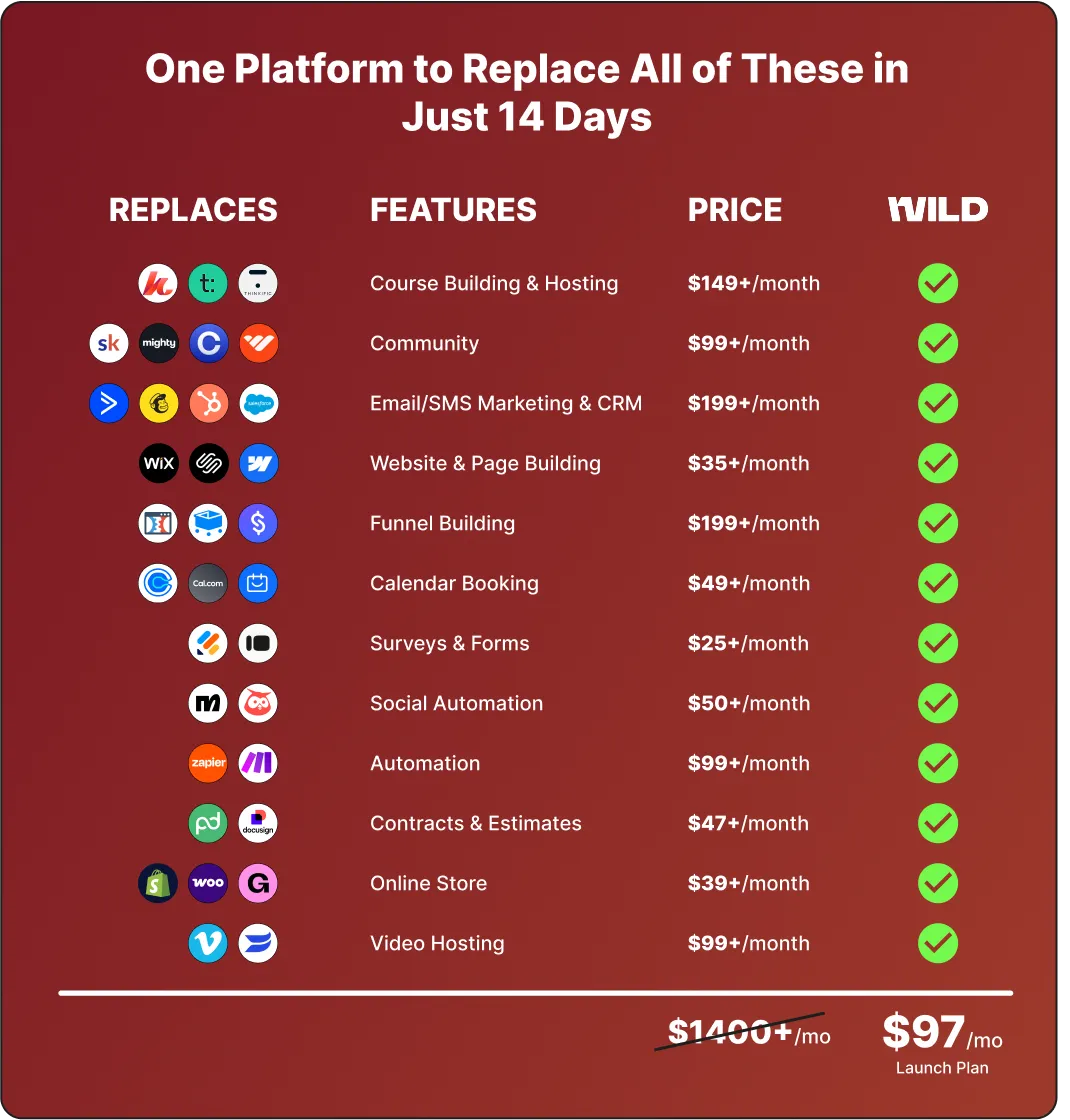 Those tools each handle one piece of your business. Wild Funnels handles everything , marketing, CRM, automations, pipelines, courses, and communities, in one place.